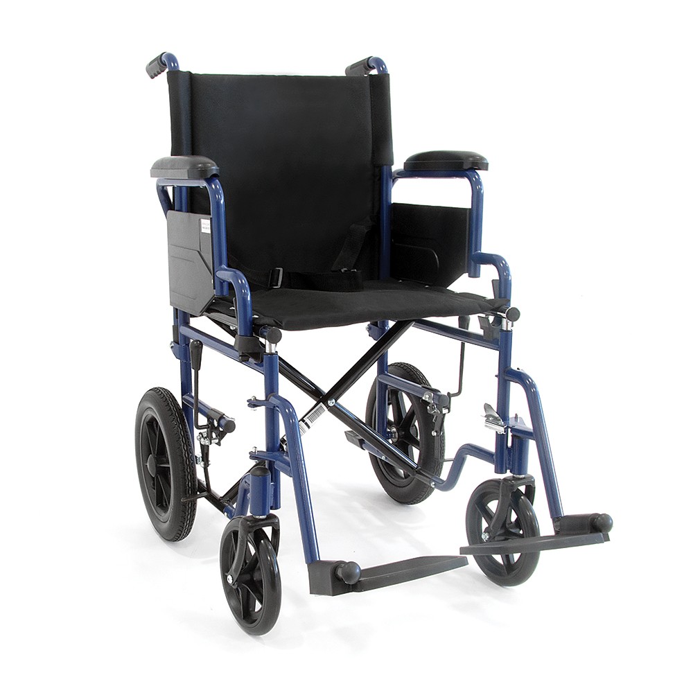 Πτυσσόµενο αµαξίδιο µεταφοράς µε µεταλλικό σκελετό ακρυλικής βαφής, χρώματος μπλέ. Πλαϊνά τύπου “Flip-up”. Υποπόδια αφαιρούµενα και ρυθµιζόµενα. Φέρει ζώνη ασφαλείας.