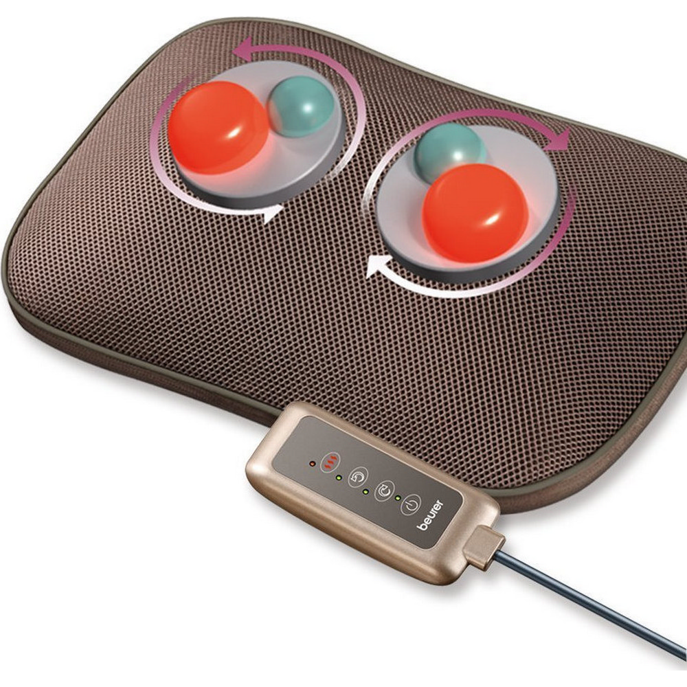 Mαξιλάρι μασάζ Shiatsu θερμαινόμενο του οίκο Beurer Γερμανίας. Διαθέτει 4 ισχυρές περιστρεφόμενες κεφαλές ανά ζεύγη που κάνουν αυθεντικό μασάζ shiatsu. Ιδανικό για χαλαρωτικό μασάζ σε αυχένα, πλάτη, μέση, πόδια και πέλμα.