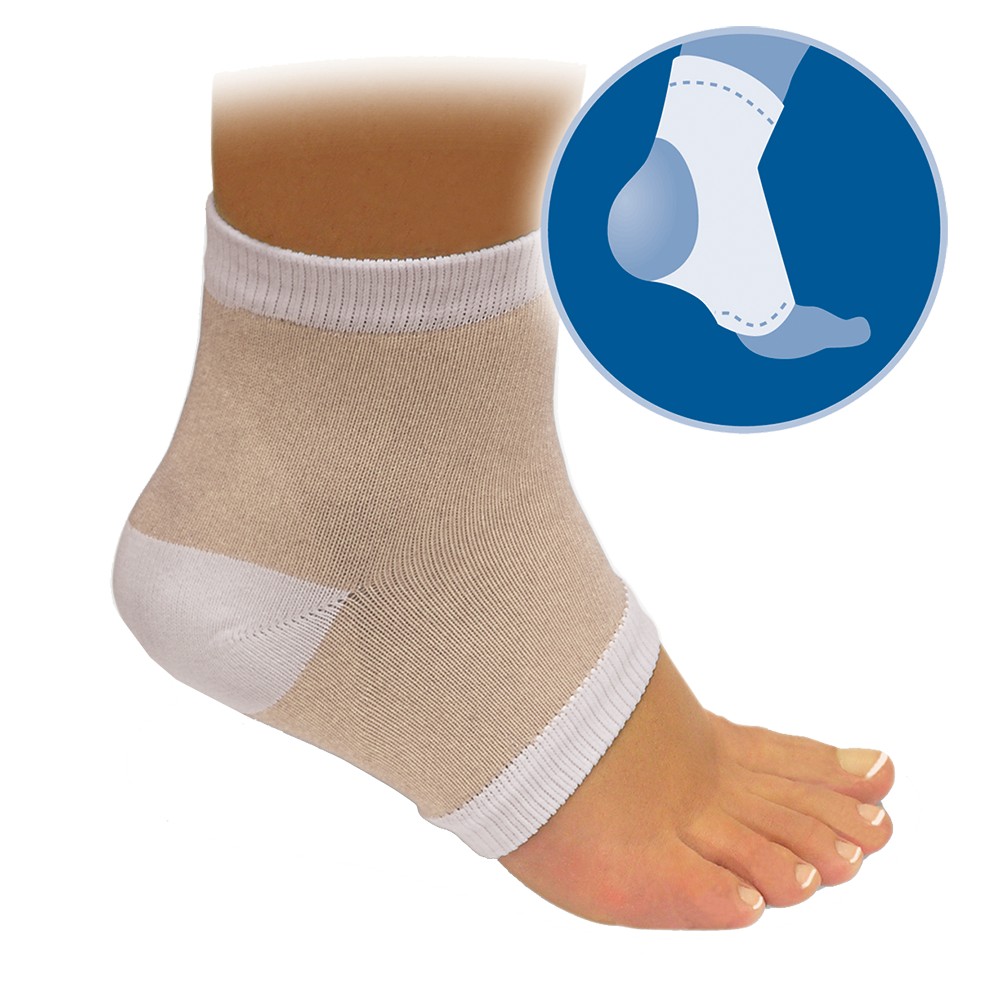 Ελαστικά καλτσάκια ανοικτών δακτύλων, με ενσωματωμένο στην πτέρνα ανατομικό επίθεμα από πολυμερές πυκνό gel 3mm. Εφαρμόζουν εύκολα. Απορροφούν την πίεση, μειώνουν την τριβή. Το gel εφάπτεται του δέρματος και απελευθερώνει σταδιακά ειδικό έλαιο με ενυδατική δράση. Ανακουφίζει από τον πόνο που προκαλείται από τη θυλακίτιδα και τους μικροτραυματισμούς της πτέρνας. Προλαμβάνουν τη δημιουργία τυχόν εκδορών. Συνιστάται η χρήση κατά τη διάρκεια της νύχτας σε περίπτωση δερματικού έλκους. Πλένονται.