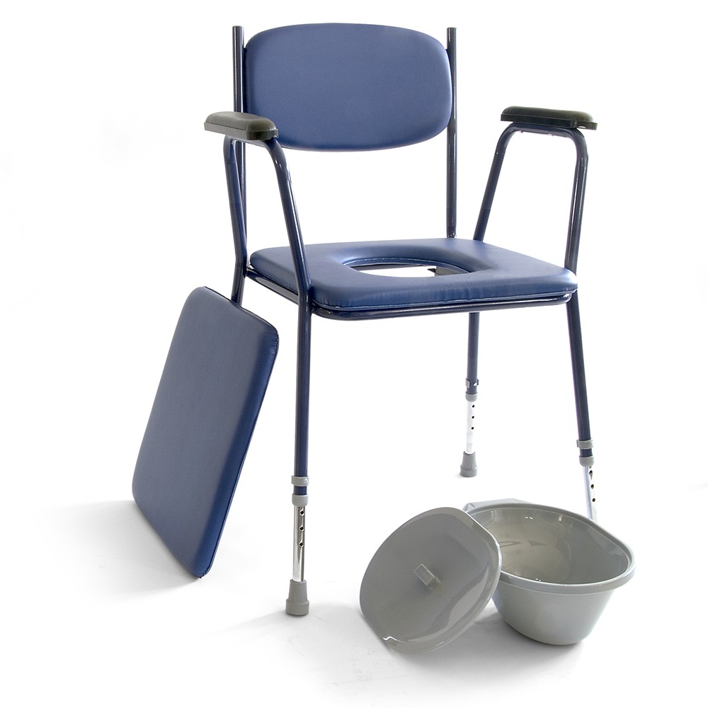 Καρέκλα µπάνιου µε αδιάβροχη επένδυση. Το ύψος είναι ρυθµιζόµενο για εύκολη εφαρµογή πάνω από την λεκάνη της τουαλέτας. Κάθισµα µε οπή και δοχείο WC µε καπάκι. Συνοδεύεται επιπλέον από κάθισµα για περισσότερη άνεση.