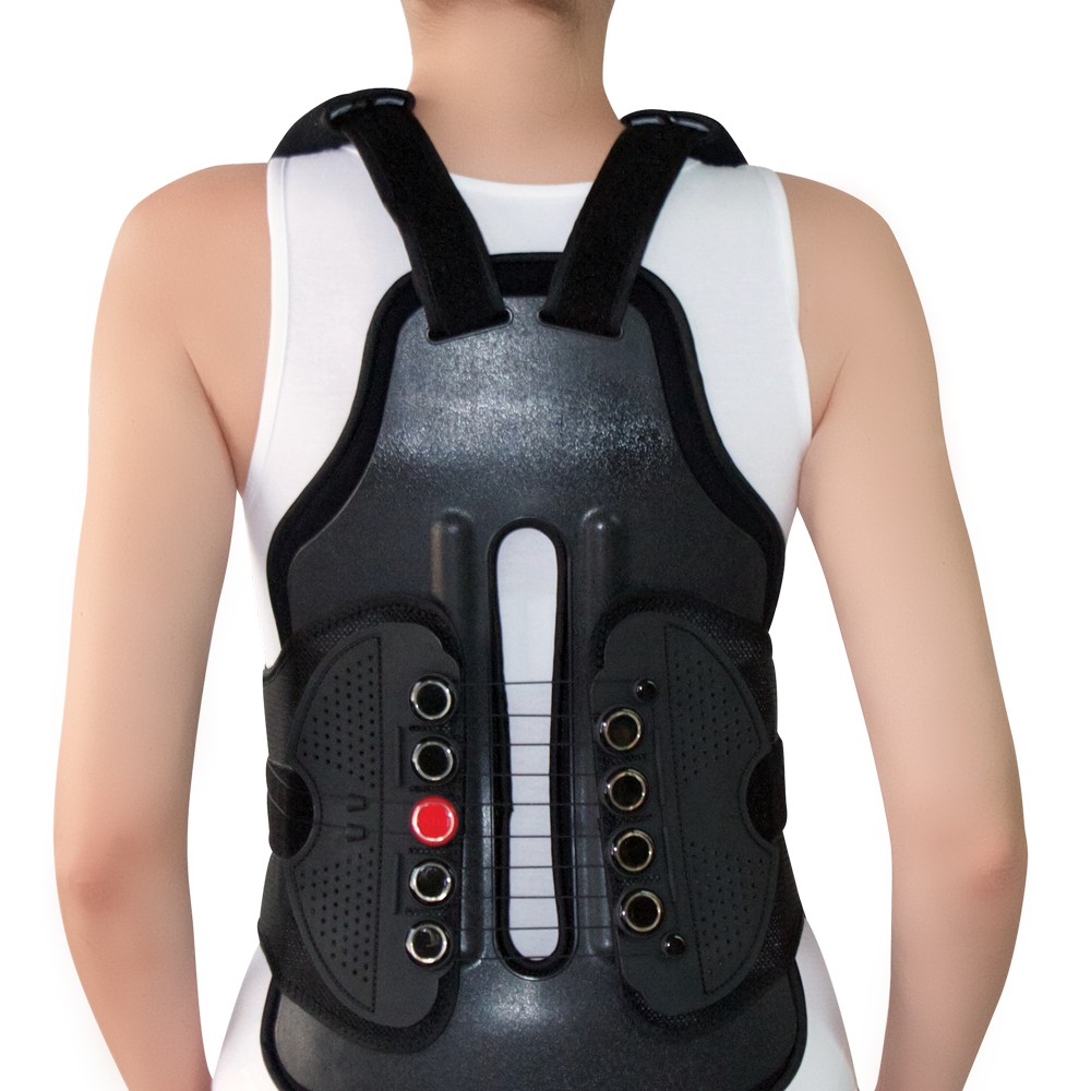 Αποτελείται από οπίσθιο θωρακοοσφυϊκό εργονομικό και ανατομικά σχεδιασμένο τμήμα. Φέρει πρόσθιο στερνικό πίεστρο ρυθμιζόμενου ύψους, για έκταση ή υπερέκταση του κορμού. Έχει εσωτερική αφρώδη, μαλακή και υποαλλεργική επένδυση. Αυτοκόλλητη ζώνη με μηχανισμό βαθμιαίας αύξησης συμπίεσης και σταθεροποίησης του κορμού. Η ζώνη είναι αυτοκόλλητη και προσθαφαιρούμενη, αναλόγως της πορείας της υγείας του ασθενή. Ρυθμιζόμενες τιράντες στήριξης της σπονδυλικής στήλης με ενσωματωμένα μαξιλαράκια ώμου. Επιδέχεται εφαρμογής αυτοκόλλητου συστήματος αεροθαλάμων για την αποφόρτιση της σπονδυλικής στήλης (Κωδικός 04-2-031).