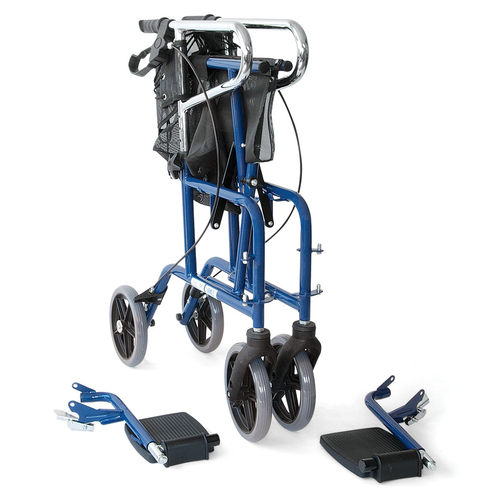 Τροχήλατος περιπατητήρας “Rollator” µε προσθαφαιρούµενα υποπόδια. Λαβές µε σύστηµα φρένων, εύκολο στη χρήση. Το ύφασµα της πλάτης είναι αεριζόµενο. Φέρει σάκο µεταφοράς προϊόντων. Οι τροχοί είναι συµπαγείς 8″χ2″. Πτυσσόµενος για εύκολη µεταφορά και αποθήκευση. Χρησιµοποιείται και ως αµαξίδιο µεταφοράς. Xρώµα µπλε.